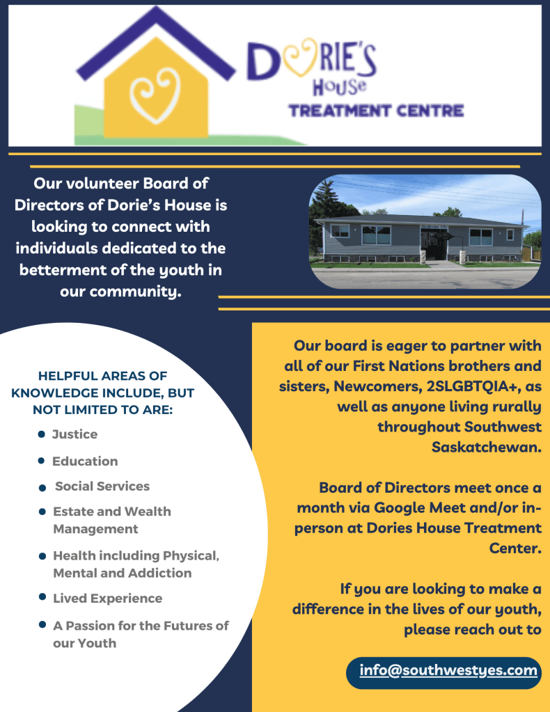 SWYES, Inc., is a registered charity (No. 815316377) operating Dorie’s House, a youth shelter located in Swift Current, SK.